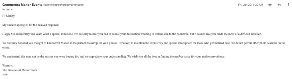 What I found myself wrestling with wasn’t the “no” itself — it was the contrast between that response and what I often see celebrated in our industry: community, collaboration, and supporting one another. As a fellow wedding vendor, it felt disheartening to see how quickly a story like ours could be dismissed when it didn’t fit within a policy box. Especially from a venue with so much emphasis on “community.” They are often hosting gatherings at Greencrest meant for networking and connection. I thought I was a member of their vendor community, but that didn’t hold any weight.