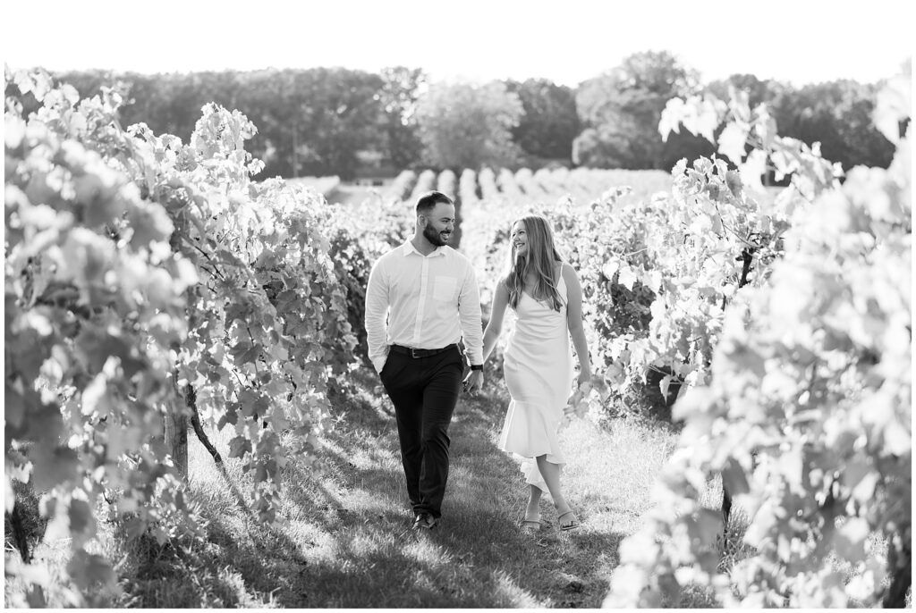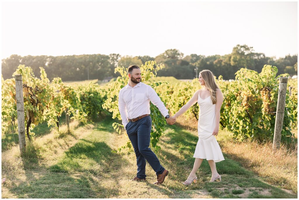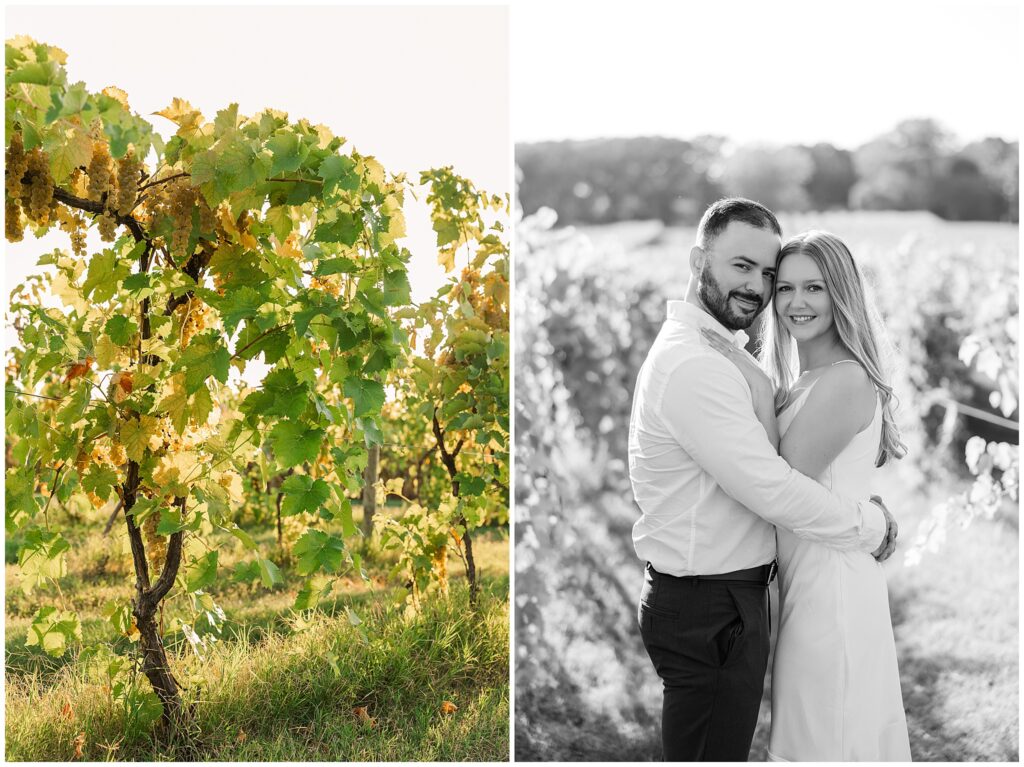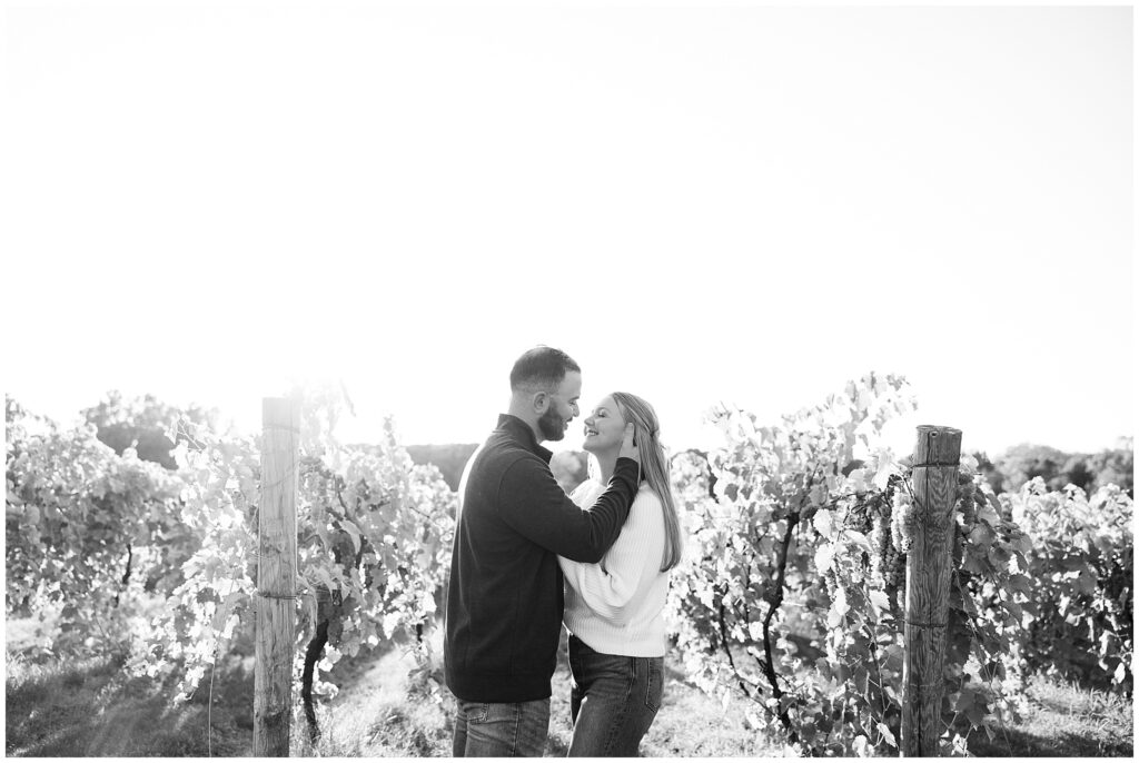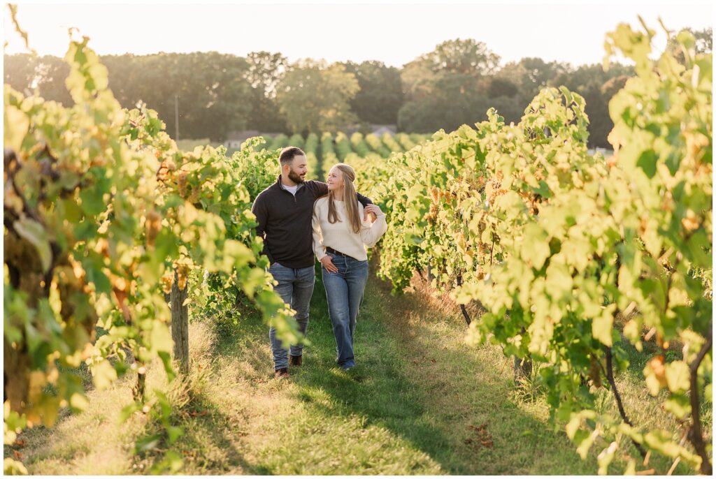 For their vineyard engagement session, we met at 12 Corners Vineyard in Benton Harbor on one of those October days that felt like summer was making a comeback. It was warm—unseasonably warm—and the sun was bright and strong. They had planned for cozy fall weather and planned outfits with sweaters. Instead, we laughed our way through the heat, finding bits of shade between the vines and making the most of every golden patch of light.