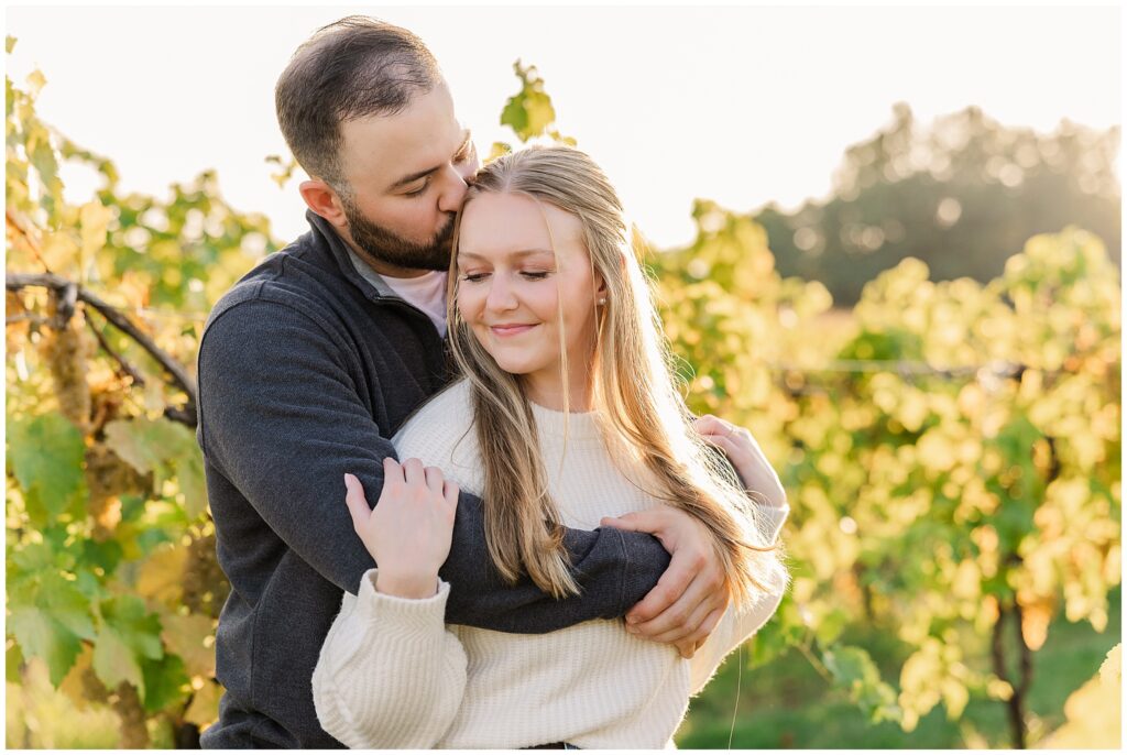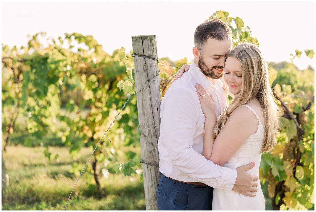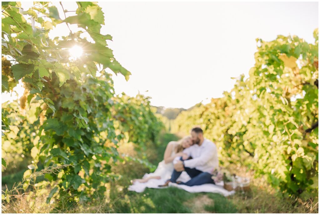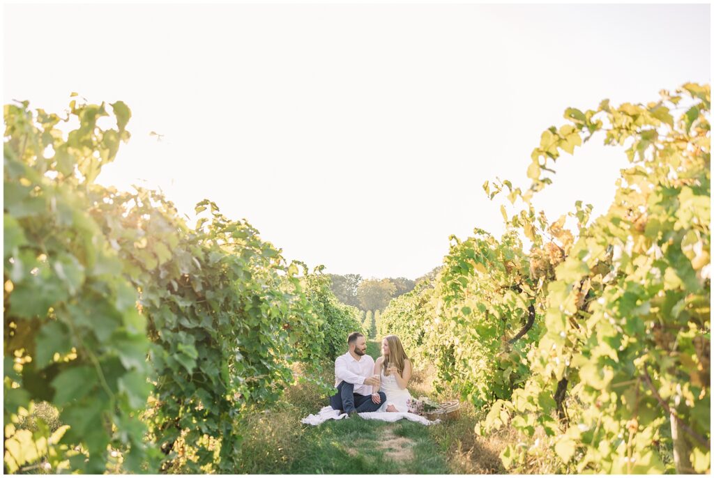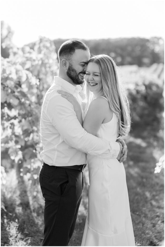 For their vineyard engagement session, we met at 12 Corners Vineyard in Benton Harbor on one of those October days that felt like summer was making a comeback. It was warm—unseasonably warm—and the sun was bright and strong. They had planned for cozy fall weather and planned outfits with sweaters. Instead, we laughed our way through the heat, finding bits of shade between the vines and making the most of every golden patch of light.